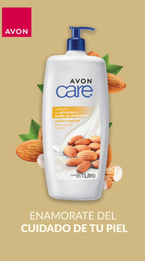 La crema Avon con extracto de almendras de la línea Avon Care es una loción corporal diseñada para pieles secas a extra secas, ofreciendo hasta 48 horas de hidratación profunda y seis beneficios 6 en 1: hidrata, nutre, suaviza, protege, repara y revitaliza la piel. Su fórmula, que incluye extracto de almendras y glicerina, tiene una textura ligera que se absorbe rápidamente sin dejar sensación grasosa, dejando la piel suave, sedosa y con un delicado aroma a almendras.